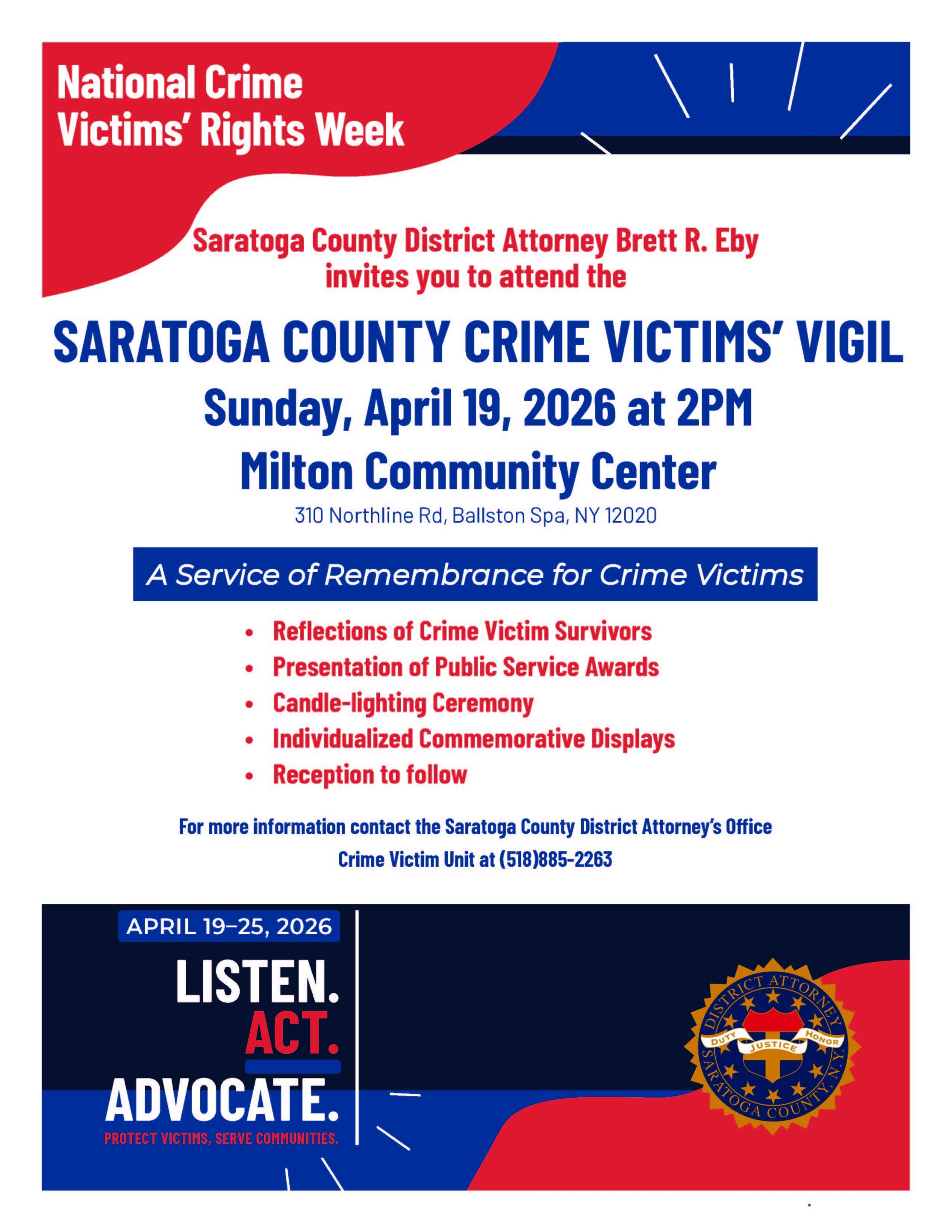 Saratoga County, NY –, Saratoga County District Attorney Brett Eby, announced that the Saratoga County District Attorney’s Office will host the annual Saratoga County Crime Victims’ Vigil on Sunday, April 19, 2026, at 2:00 p.m. at the Milton Community Center.